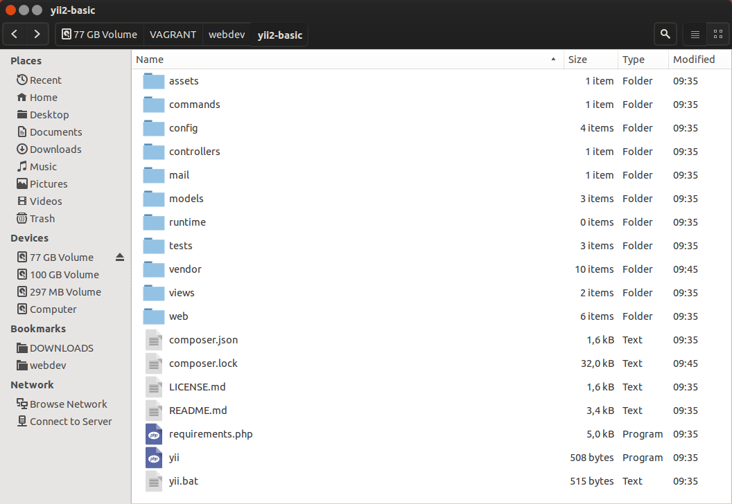 Lakukan instalasi Yii 2.0 seperti biasa, kali ini saya menggunakan Yii 2.0 Basic untuk pengaturan custom directory Yii 2.0 Advanced akan kita bahas di artikel berikutnya. Lakukan instalasi Yii 2.0 seperti biasa. Untuk Petunjuk instalasi bisa anda lihat di sini. Secara default struktur direktori aplikasi Yii 2.0 Basic seperti gambar berikut.